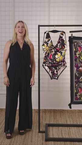 This one piece swimwear stuns with a plunging neckline, draped back, and a statement hardware detail at the chest. Soft cups and gentle shirring flatter and support your hourglass.