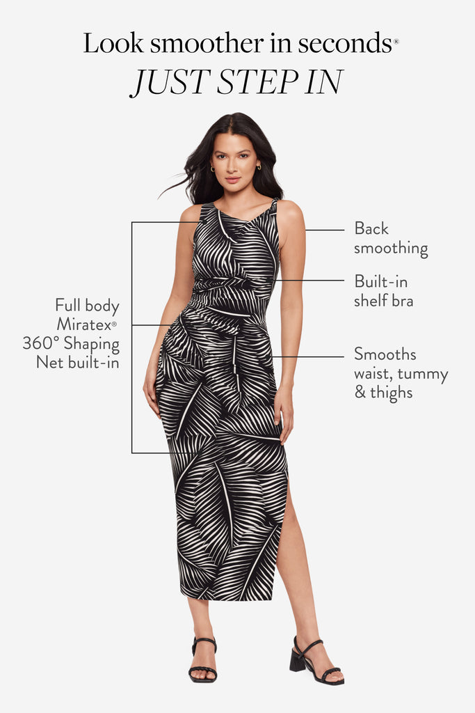 Powered by Miratex® 360° Shaping Net: invisible targeted compression for tummy, waist & thighs. Plus built-in bust support and back smoothing.