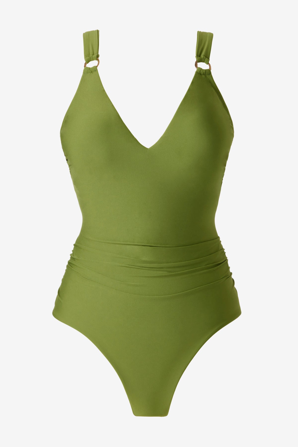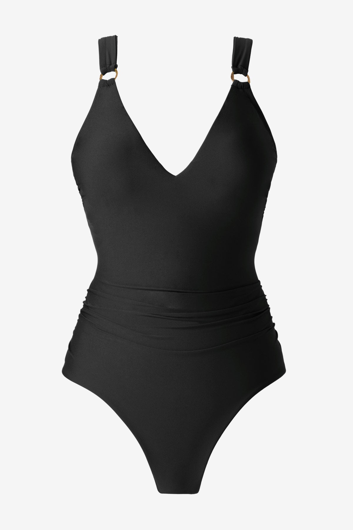 Metal rings highlight the deep V-neckline of this adjustable back swimsuit, with wide straps that transition into a customizable racerback design.