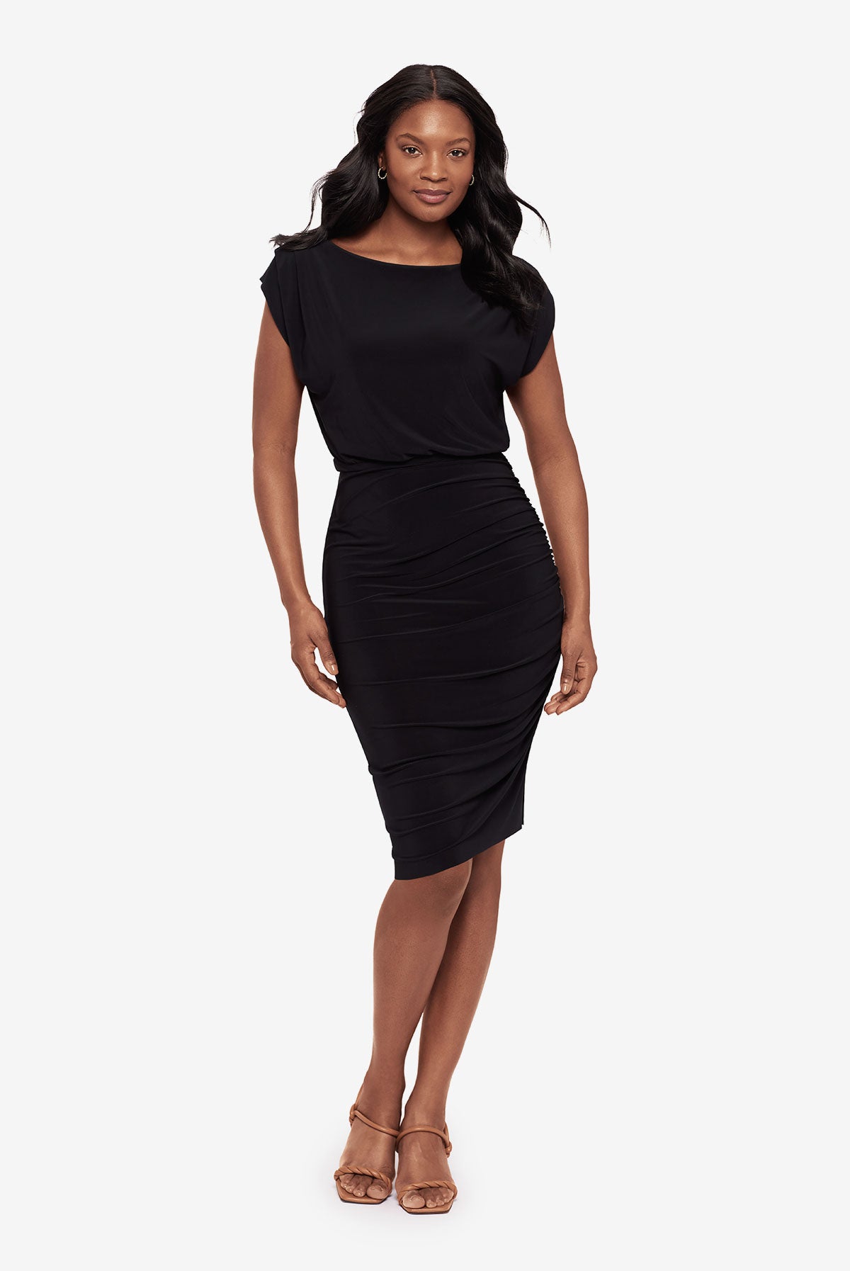 Sculpted elegance, with just enough room to play. A softly draped neckline and cap sleeves add polish, while the subtly blousy top flows into a shaping skirt that flatters your curves with every step.