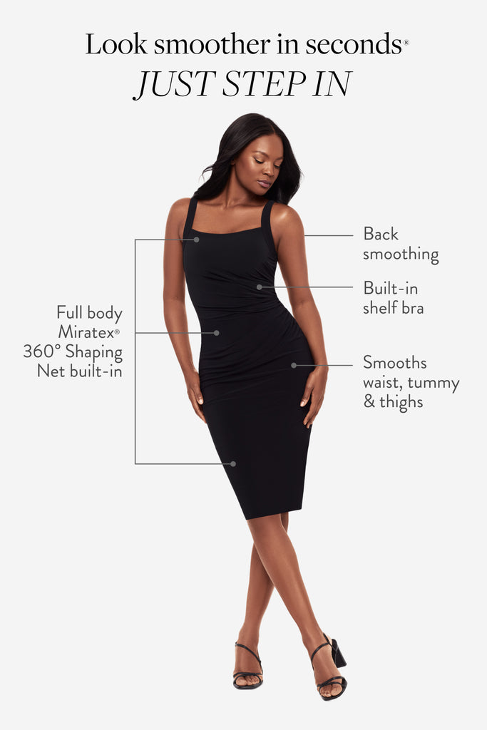 Powered by Miratex® 360° Shaping Net: invisible targeted compression for tummy, waist & thighs. Plus built-in bust support and back smoothing.