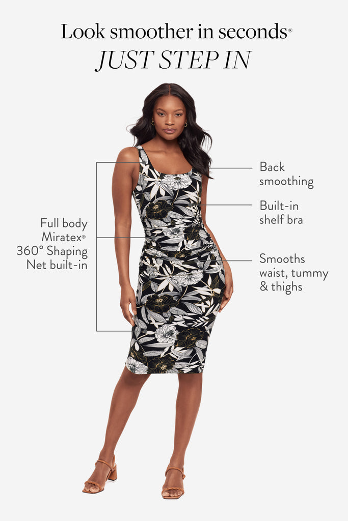 Powered by Miratex® 360° Shaping Net: invisible targeted compression for tummy, waist & thighs. Plus built-in bust support and back smoothing.