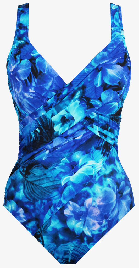 Hello, blue. Think mystical flowers that live beneath the sea in our stunning Sous Marine collection. Our top-selling Revele style offers a sculpted, contoured, and supportive fit. Artfully draped bodices on each design draw the eye in and up for a most maximum slimming effect. The brightest blue hues form an enticing floral design across your silhouette.