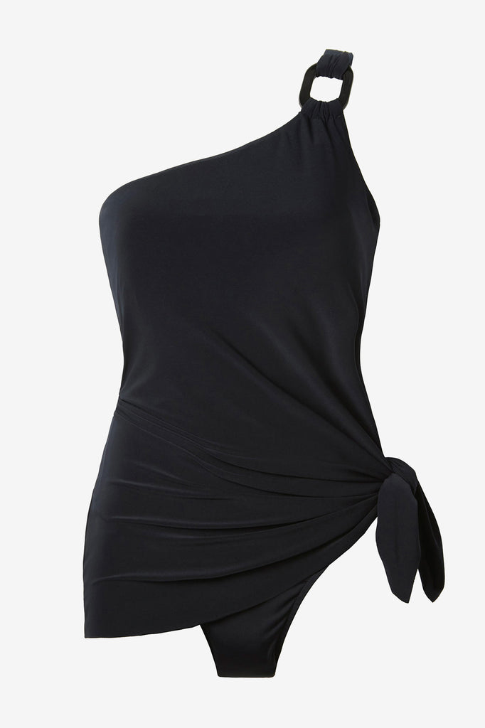Chic style is imminent in the Magicsuit Solid Amal Swimsuit, #6008041, as this luxurious one-piece wonder works a charming effect as built-in control fabric smoothes and shapes your figure. The flattering draped front can be tied at the side or worn long to accentuate or hide your curves. Romantic, glamorous, and oh-so-elegant, this black and gold nautical-inspired design is everything you could want under the golden sun and beyond. The fixed, one-shoulder strap comfortably stretches and features a stylish square embellishment. Made with LYCRA XTRA LIFE‚ Spandex for a long-lasting fit.