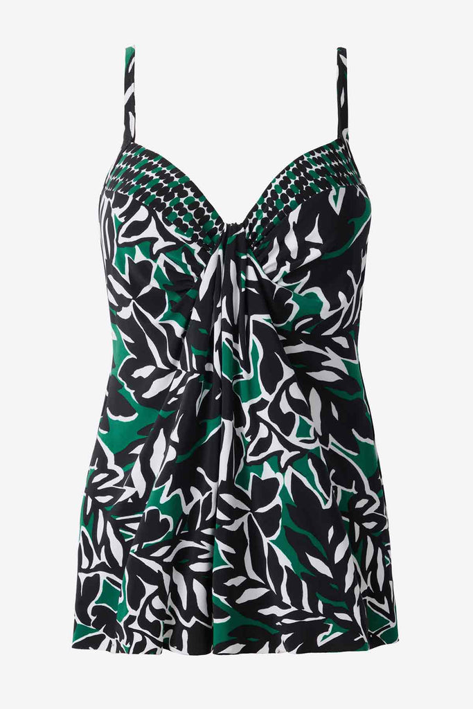 This Miraclesuit front draping tankini creates an easy A-line silhouette, concealing a molded foam cup bra with underwire for maximum support.