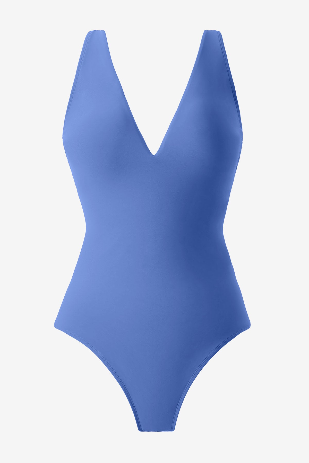 Effortless from every angle, with a sleek V-neckline and modern scoop back. Shaping swimwear fabric smooths without a trace, while a built-in shelf bra gently lifts.