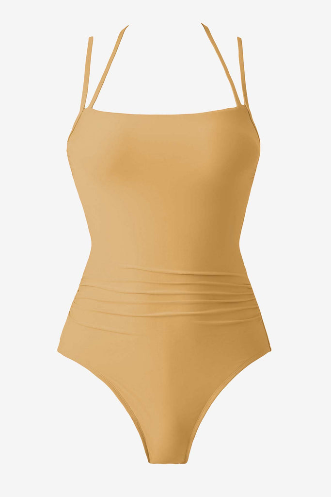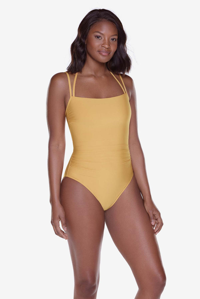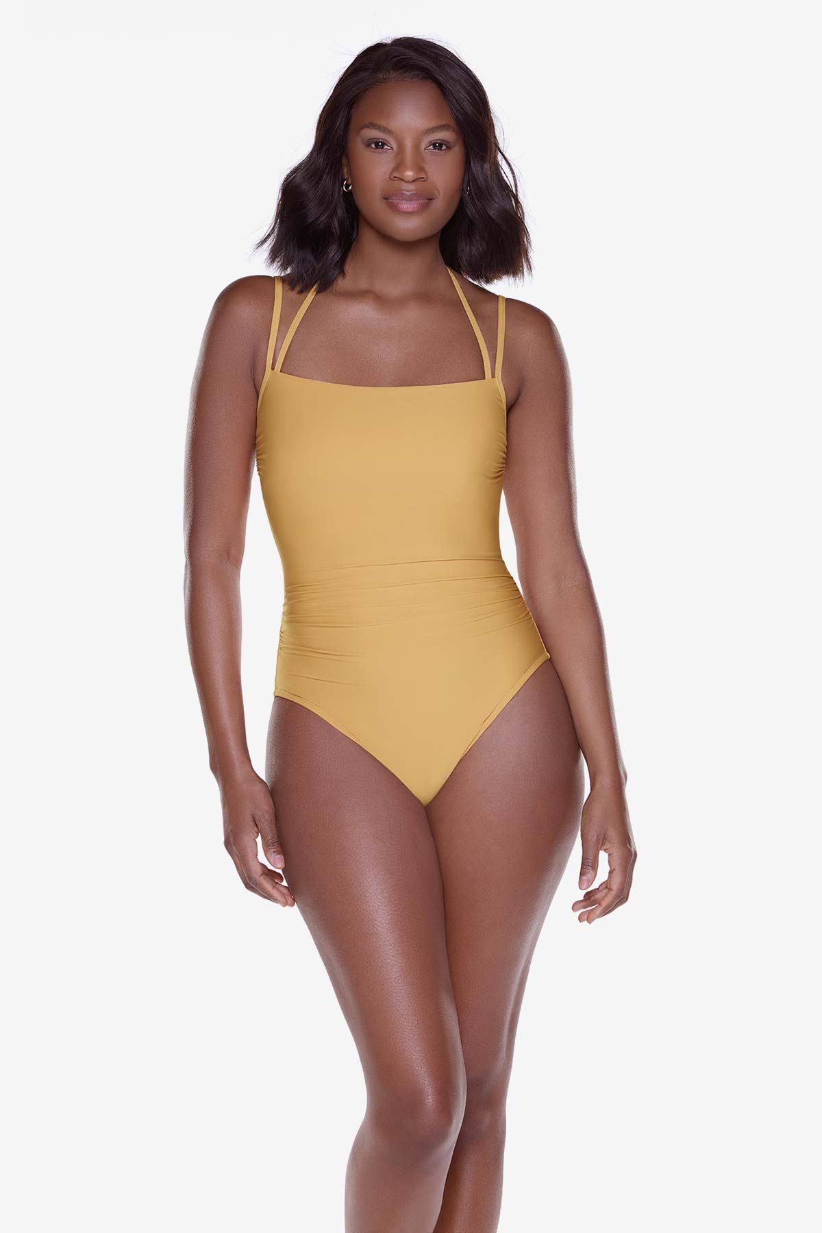 This chic tie back swimsuit features airy doubled straps—one pair ties at the neck, the other forms a strappy back detail that can be tightened to your liking. Underneath, a shelf bra and sculpting fabric shape your hourglass.