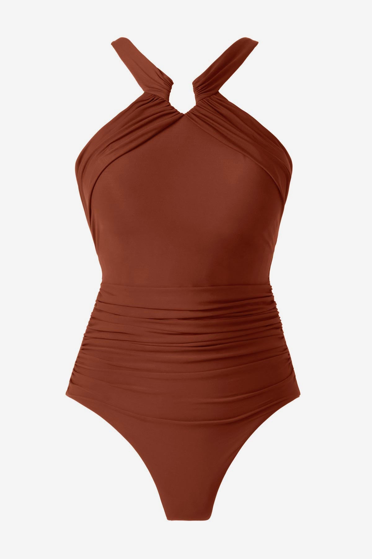 The Aphrodite celebrates and sculpts your figure with a unique halter-styled neckline, soft cup bra, and precise shirring.